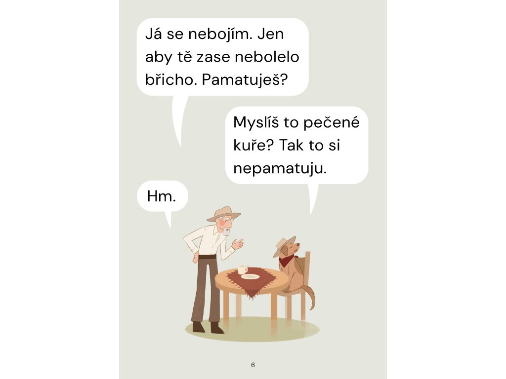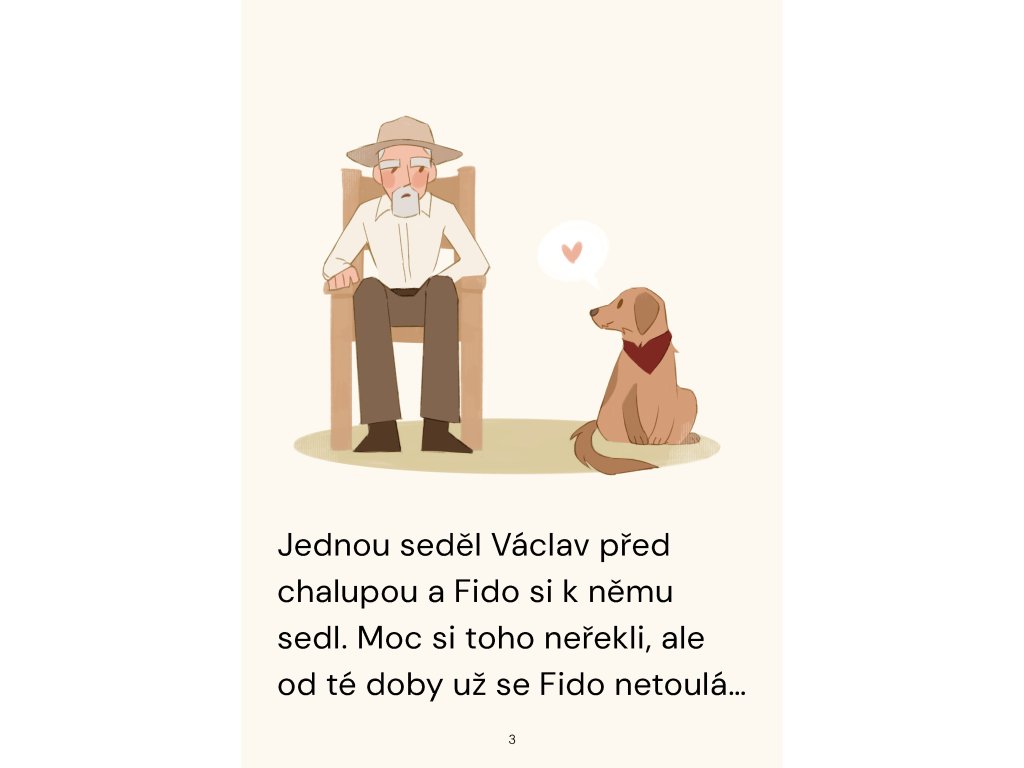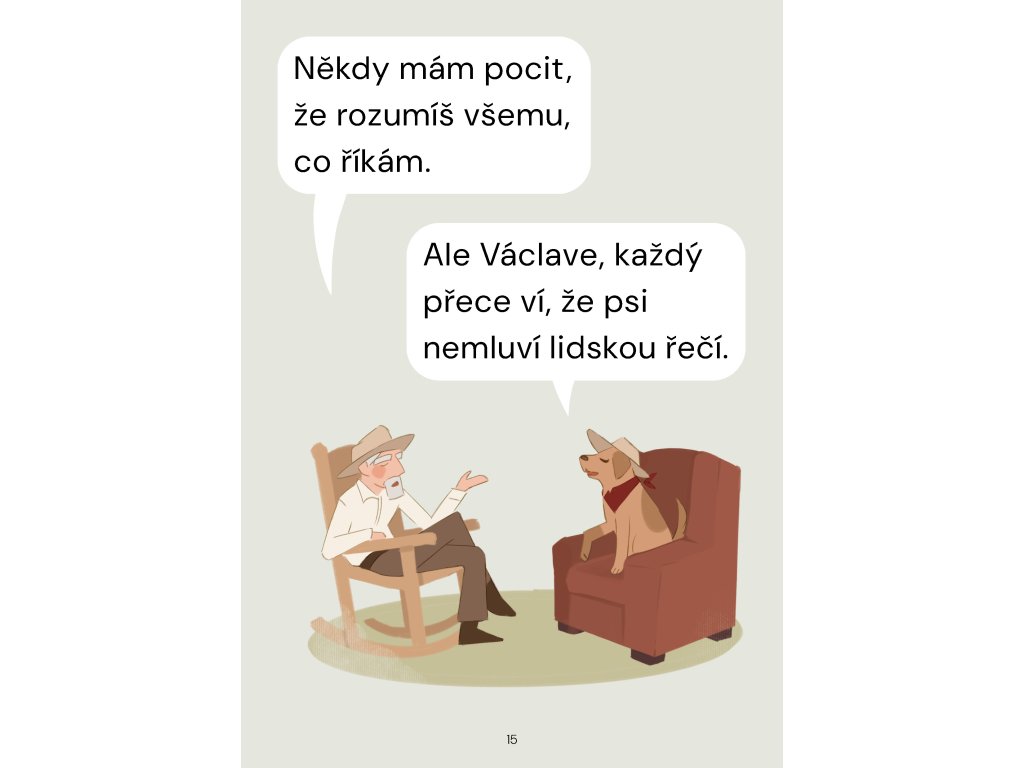 Každý přece ví, že psi nerozumí lidské řeči. Jenže Václav a Fido spolu bydlí v jedné chalupě a povídají si celé dny. Jeden bez druhého si život nedokážou představit. I když by to nikdy, nikdy nepřiznali.