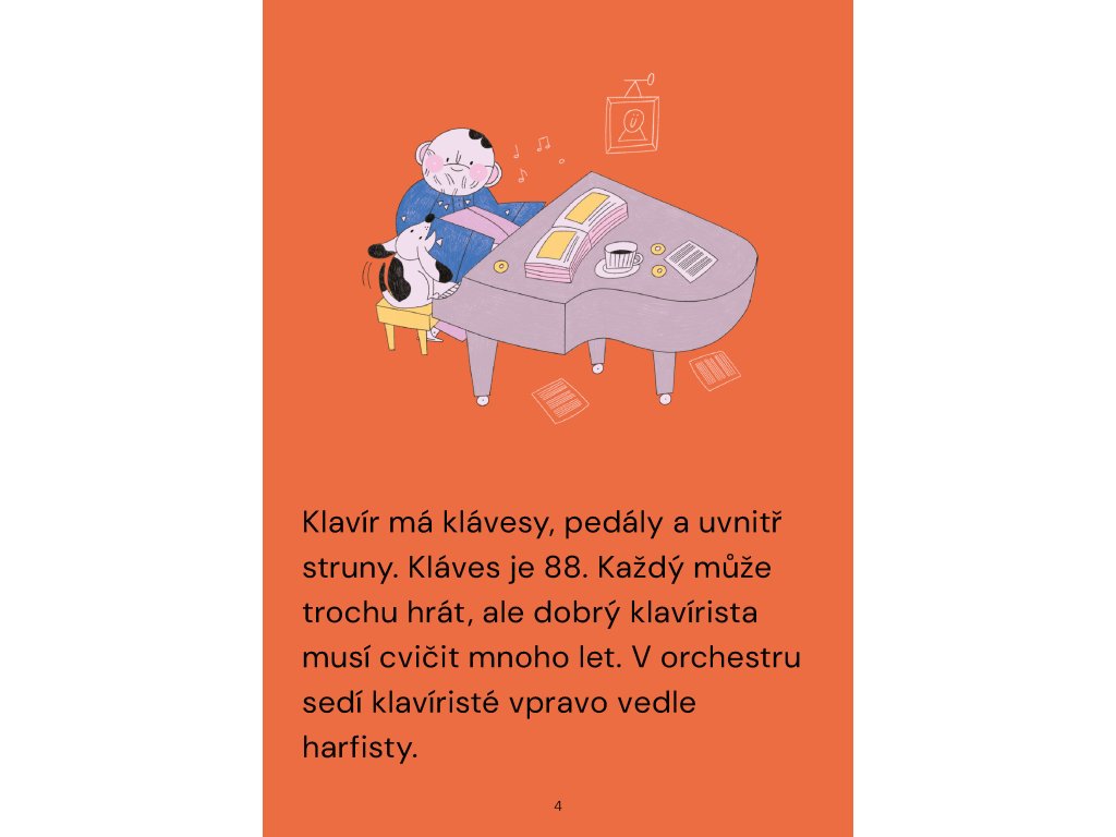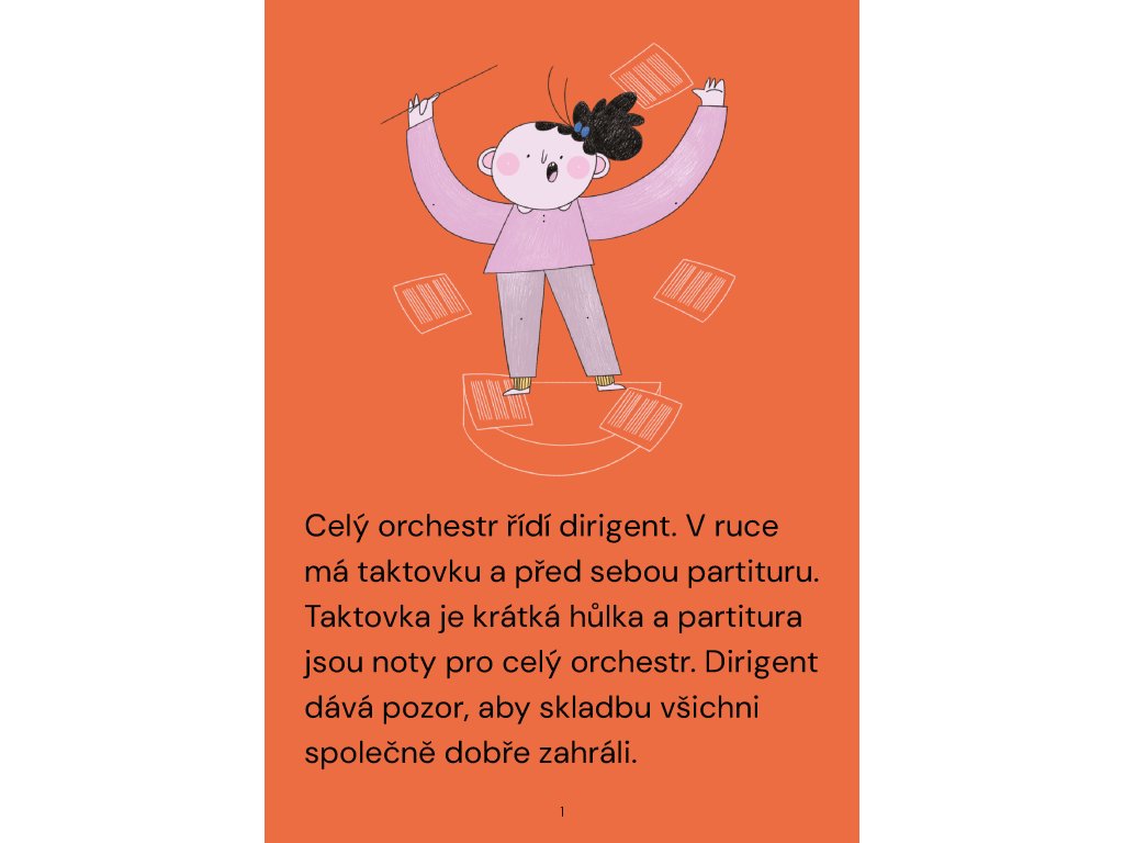 Celý orchestr musí někdo řídit. Jak se takovému člověku říká? Hůlka, kterou máchá kolem sebe, se jmenuje taktovka. Díky ní ostatní vědí, jak mají hrát. V této knížce se dozvíte, které nástroje v orchestru hrají.