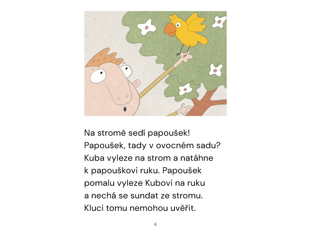 Kluci najdou v sadu papouška. Cože, papouška?! Komu asi uletěl? Papoušek sám vleze Kubovi na nataženou ruku. Odnesou si ho na chalupu a prosí rodiče, jestli si ho můžou nechat. K obědu jsou zrovna knedlíky. Už víte, jaké jméno papoušek dostane?