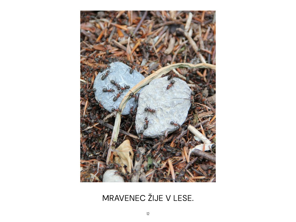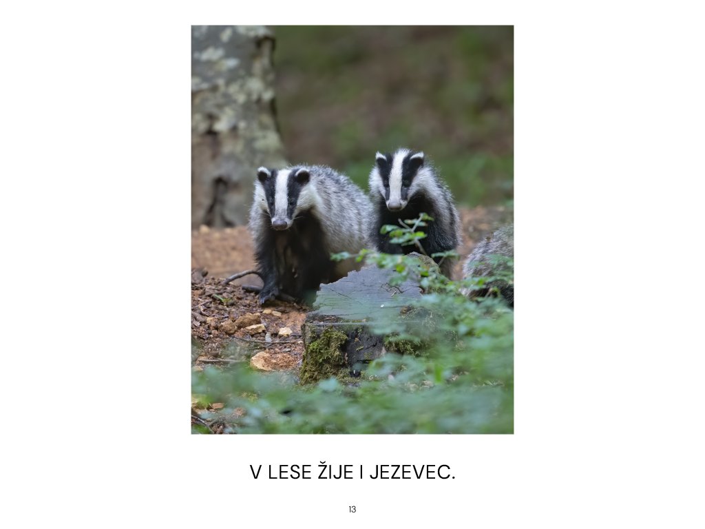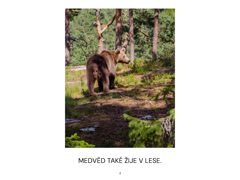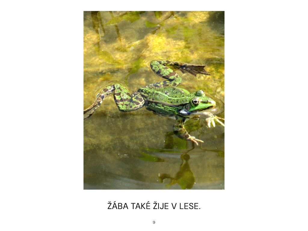 Kdo žije v lese? Třeba ježek nebo liška. Les je pro zvířata domovem. Každé zvíře má svůj pelíšek. Některá žijí v noře a některá zase ve stromě. V lese žijí také žáby!