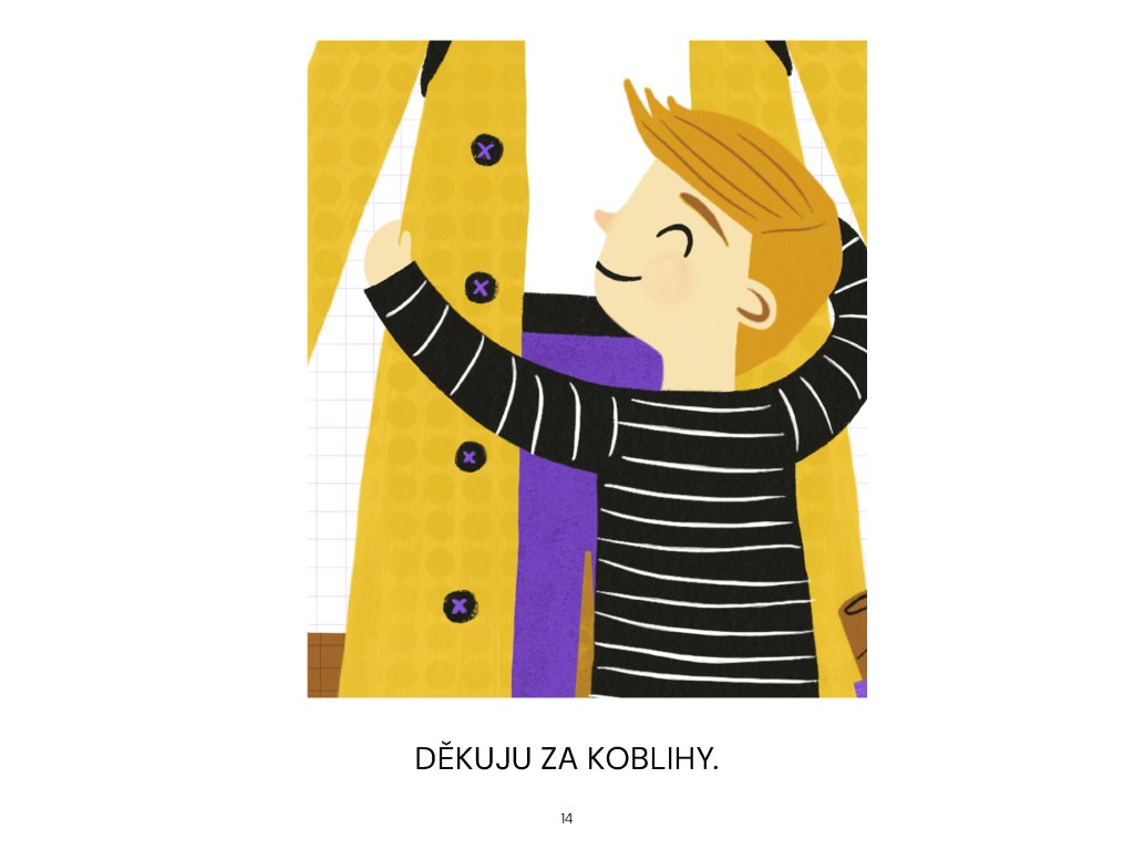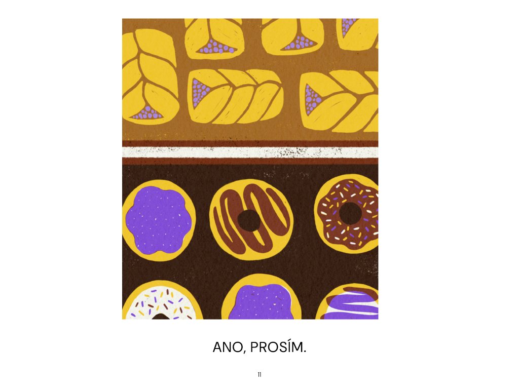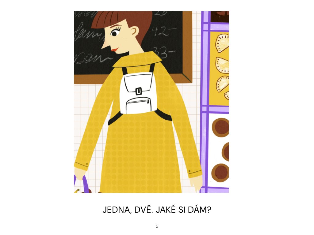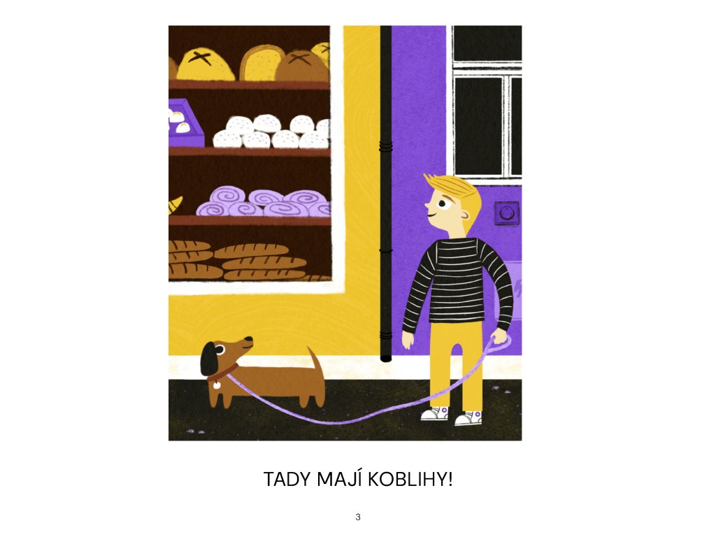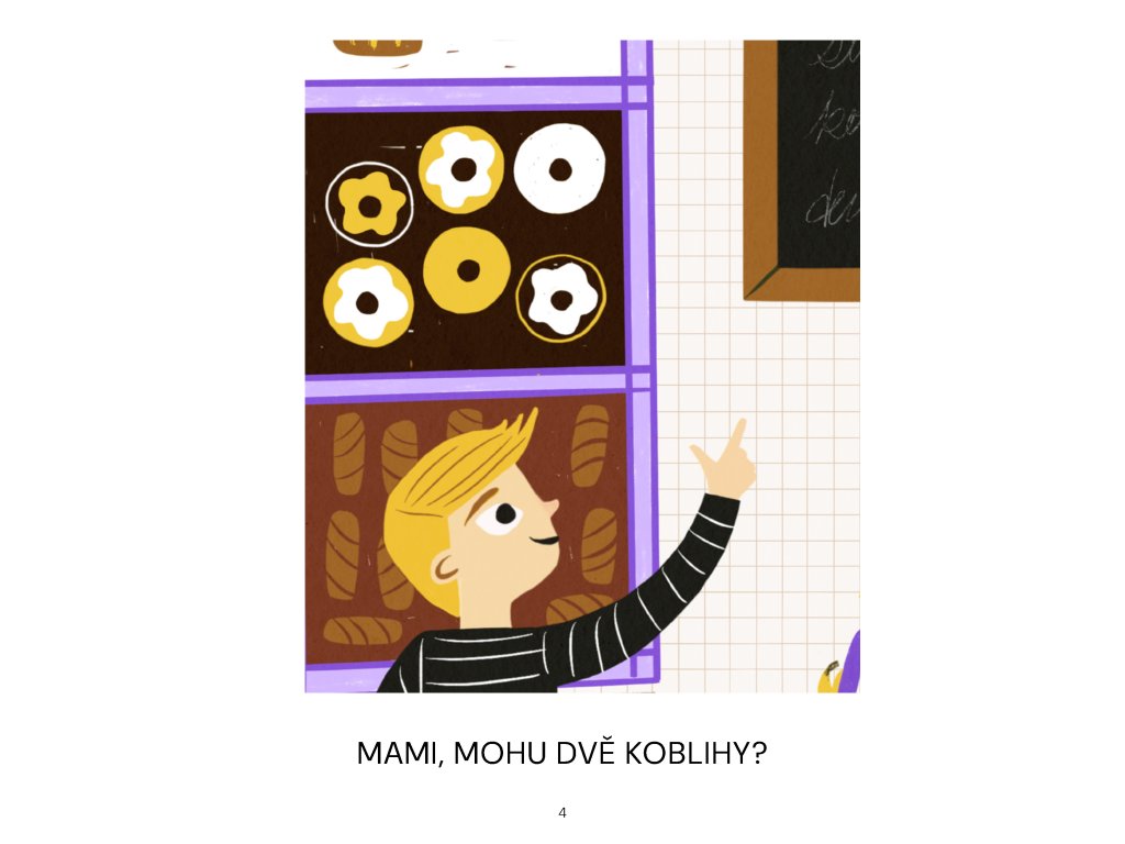 Jdeme s Alíkem do pekárny. V pekárně to krásně voní. Poprosím maminku, aby mi koupila dvě koblihy. Nakonec koupíme koblih víc. Pro koho ještě žádnou nemáme a kdo koblihu nesmí? Voňavý příběh plněný marmeládou.
