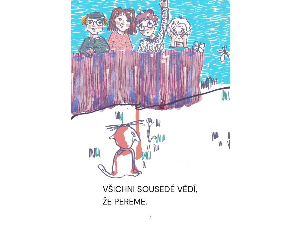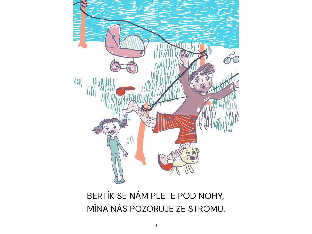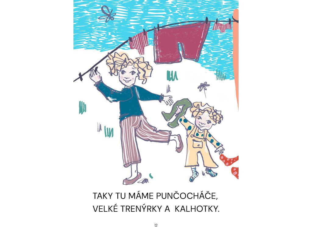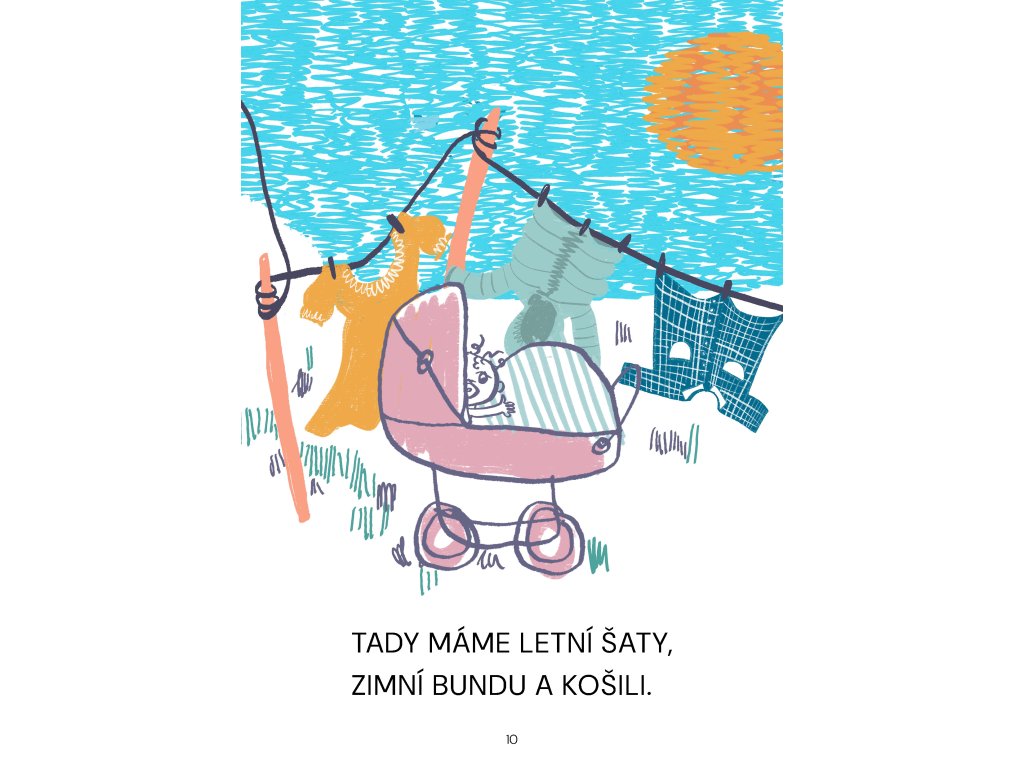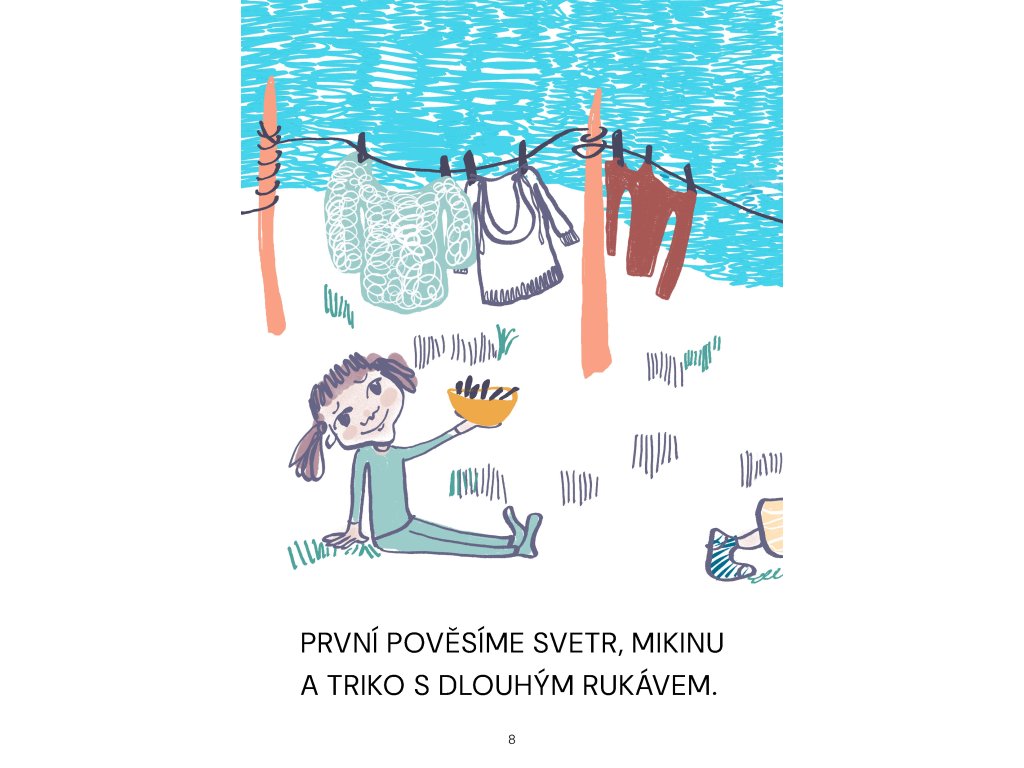 Dnes je slunečný den. Náš dům se celý třese. Všichni vědí, že pereme. Natahujeme dlouhou šňůru, budeme věšet prádlo. Bertík se nám plete pod nohy. Mína nás pozoruje ze stromu. Kdo bude podávat kolíčky?
