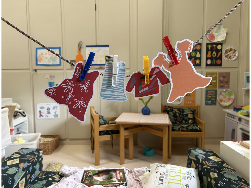 U věšení obrázkového prádla na šňůru procvičujeme jemnou motoriku, zrakové vnímání a paměť, spolupráci ve dvojicích a postup zleva doprava.